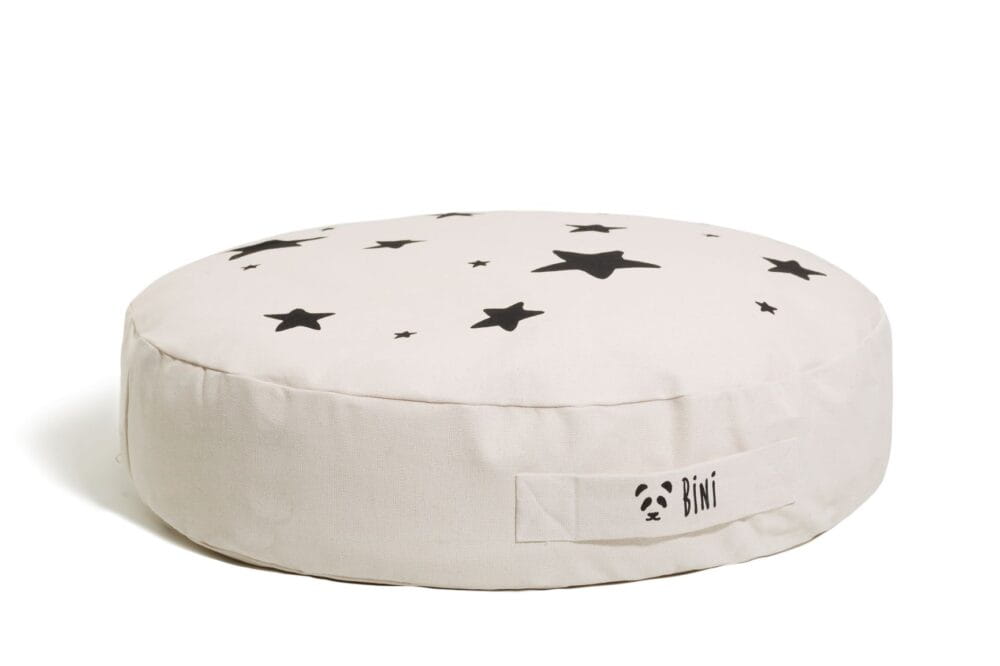 Puf wykonany jest z organicznej, tkanej w Polsce, miłej w dotyku bawełny. Materiał nie jest poddawany żadnym procesom chemicznym, nie zawiera silikonu. Nadruki wykonane są metodą sitodruku – ekologicznymi farbami wodnymi. Wewnętrzny dodatkowy worek wypełniony jest atestowanym granulatem polipropylenowym, który idealnie dopasowuje się do ciała, zapewniając jego wygodną pozycję. Ten model siedziska, posiada nadruk czarne gwiazdki z dwóch stron. Puf BiNi można prać w pralce (rekomendujemy 30 stopni), wystarczy wyjąć wewnętrzny worek, a pokrowiec wrzucić do pralki. Wymiary pufa : 72 x 18 cm