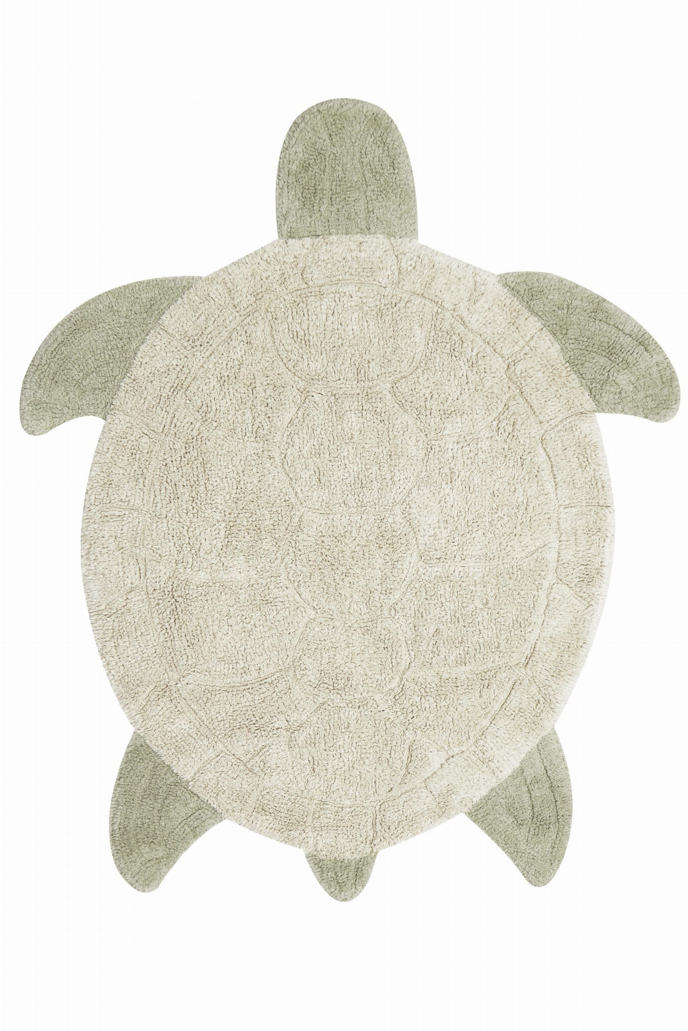 Miękki, bawełniany dywanik Sea Turtle jest uszyty w sześciokątny wzór symulujący geometryczną skorupę poprzez połączenie wysokich i niskich run w naturalnym kolorze. Głowa, łapy i ogon są tuftowane w krótkich i średnich oliwkowozielonych stosach, tworząc sylwetkę uroczego żółwia morskiego.