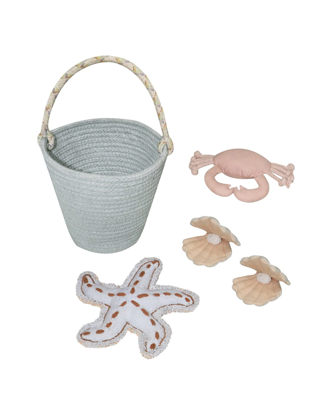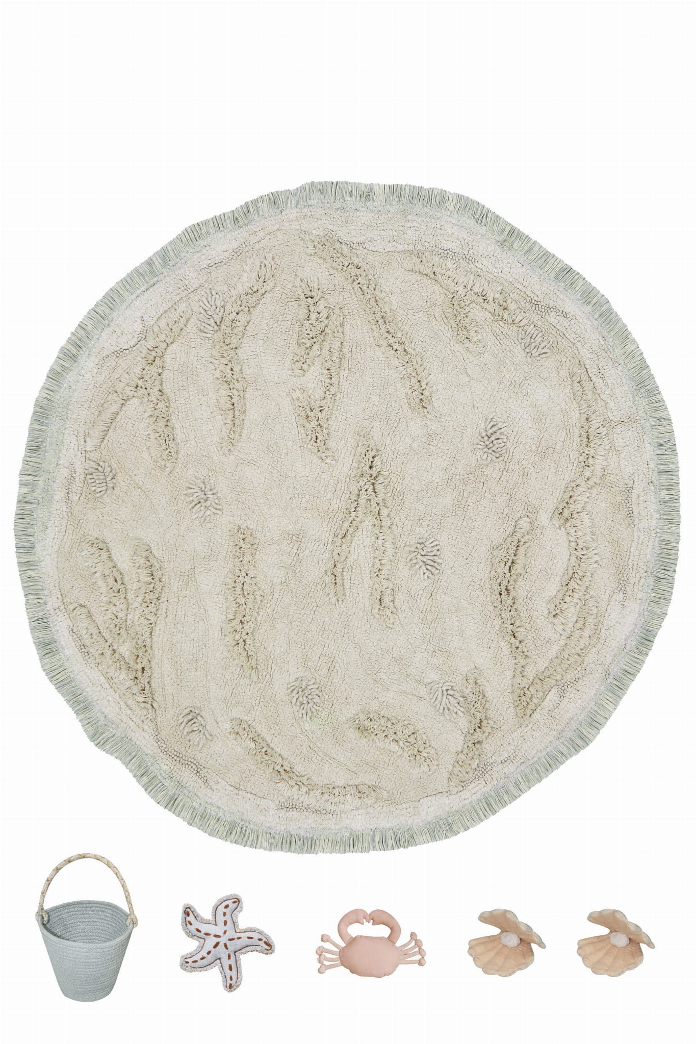 Łącząc krótkie i średniej wysokości runo w nieregularny wzór, dywanik Island przywodzi na myśl miękkie wydmy piaszczystej plaży. Otoczony krótkimi frędzlami w naturalnym i niebieskim kolorze szałwii reprezentującym brzeg oceanu. Dywanik jest dostarczany z zestawem akcesoriów do zabawy: plecionym koszykiem z niebieskiego sznurka szałwiowego, miękkim krabem, ręcznie haftowaną rozgwiazdą i dwiema muszlami z perłami.
