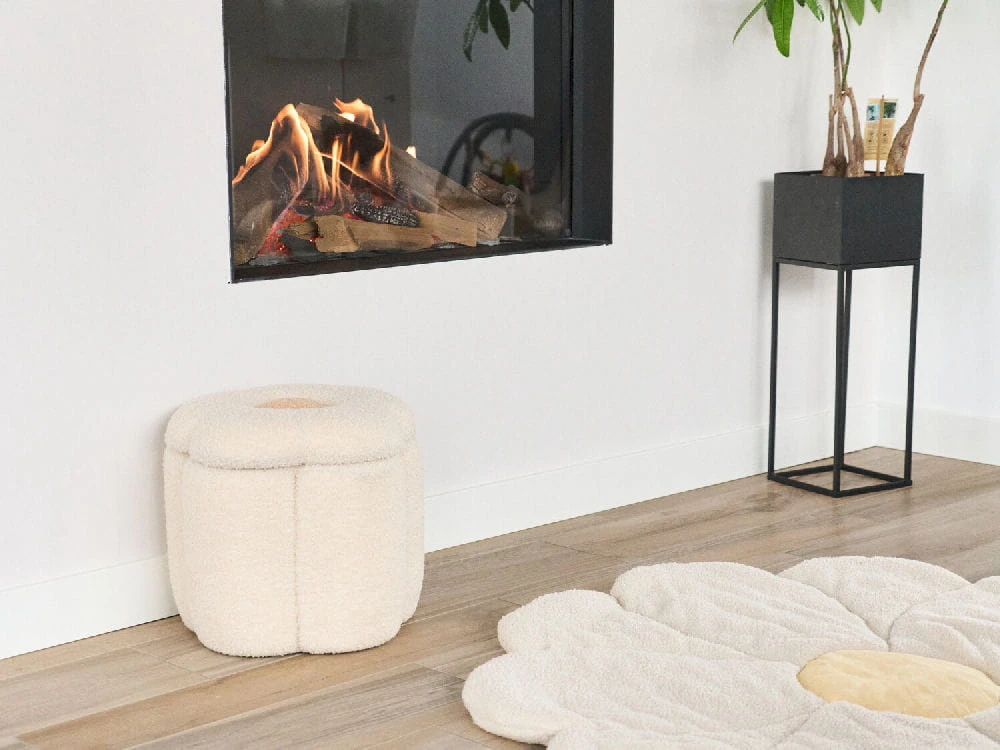Ta piękna pufa w kształcie kwiatka może służyć również jako pudełko na zabawki! Pufa uszyta jest z modnego materiału Teddy w kolorze Offwhite.
