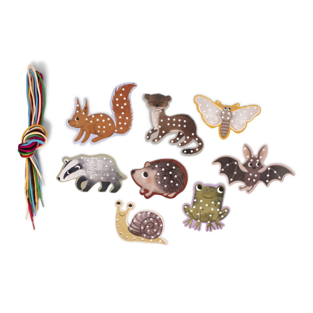 Przeplatajcie kolorowe sznurki przez szablony ręcznie ilustrowanych zwierząt, używając tylko palców i twórzcie piękne wzory, jednocześnie rozwijając umiejętności motoryczne maluszka.