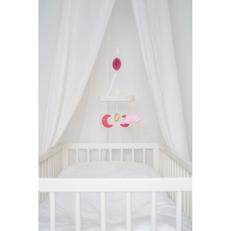 Piękna karuzela pozytywka księżyc, idealny element dekoracyjny pokoju Twojego malucha - piękna spokojna muzyczka zapewni spokojny sen. Wspaniały pomysł na prezent, dla przyszłych rodziców nawet tych najbardziej wymagających. Wirujące chmurki i księżyce, będą cudownymi przyjaciółmi maluszka.Pozytywka wykonana z weluru i bawełny, w kolorze różu. Posiada piękną, spokojną melodię, ukoi do snu nawet najbardziej wymagające maluchy. Rozbudza ciekawość u dzieci, pozytywnie wpływa na rozwój wrażliwości muzycznej, oraz rozwija koordynację wzrokowo-ruchową.Idealnie komponuje się z innymi akcesoriami dekoracyjnymi szwedzkiej marki Jabadabado, oddzielnie dokupić można uchwyt mocujący do karuzeli - do wyboru: drewniany lub plastikowy.Spraw radość swojemu maluchowi i KUP tą cudowną karuzelę pozytywkę jeszcze dziś.