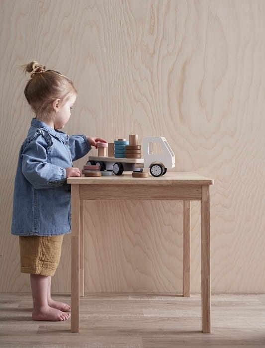Przyczepa drewnianej ciężarówki do sortowania posiada cztery kołki w różnych kształtach w których można układać pierścienie na różnych wysokościach i kombinacjach. Drewniana ciężarówka z klockami o różnych kształtach łączy w sobie najlepsze cechy zabawek manualnych oraz rozwijających zdolności rozumowania. Różne kształty i kolory klocków sprawią, że zabawa nimi będzie przyjemna i edukacyjna. Podczas zabawy dzieci uczą się kształtów, kolorów oraz precyzyjności podczas nakładania klocków na odpowiednie kołeczki. Zarówno klocki jak i pudełko zostały wykonane z wysokiej jakości materiałów. Zabawka inspiruje malucha do kreatywnej zabawy.