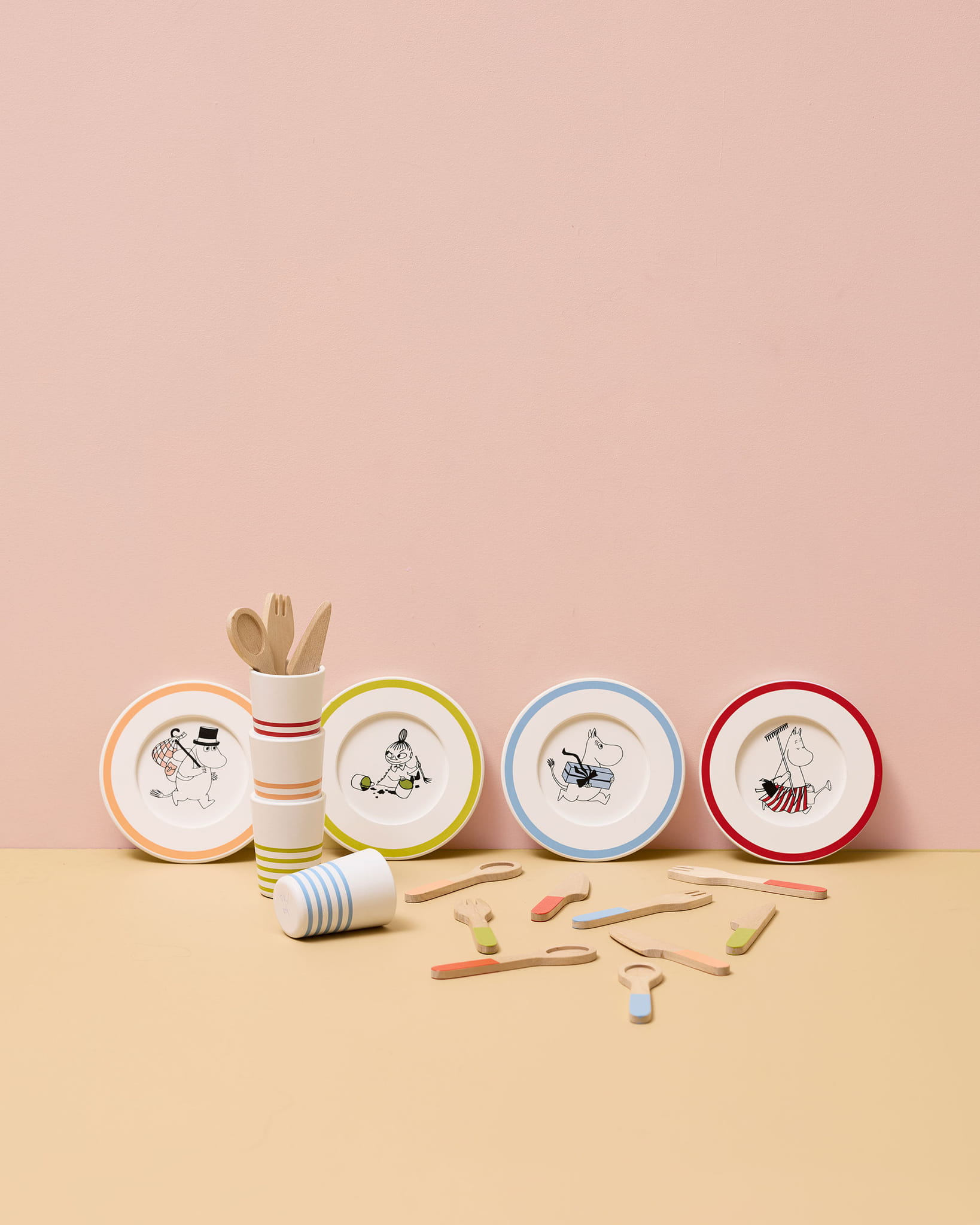 Wykonany z drewna z certyfikatem FSC zestaw obiadowy zawiera po 4 sztuki każdego elementu: talerz, kubek, widelec, nóż i łyżkę. Talerze ozdobione są nadrukami z bohaterami kultowych Muminków.