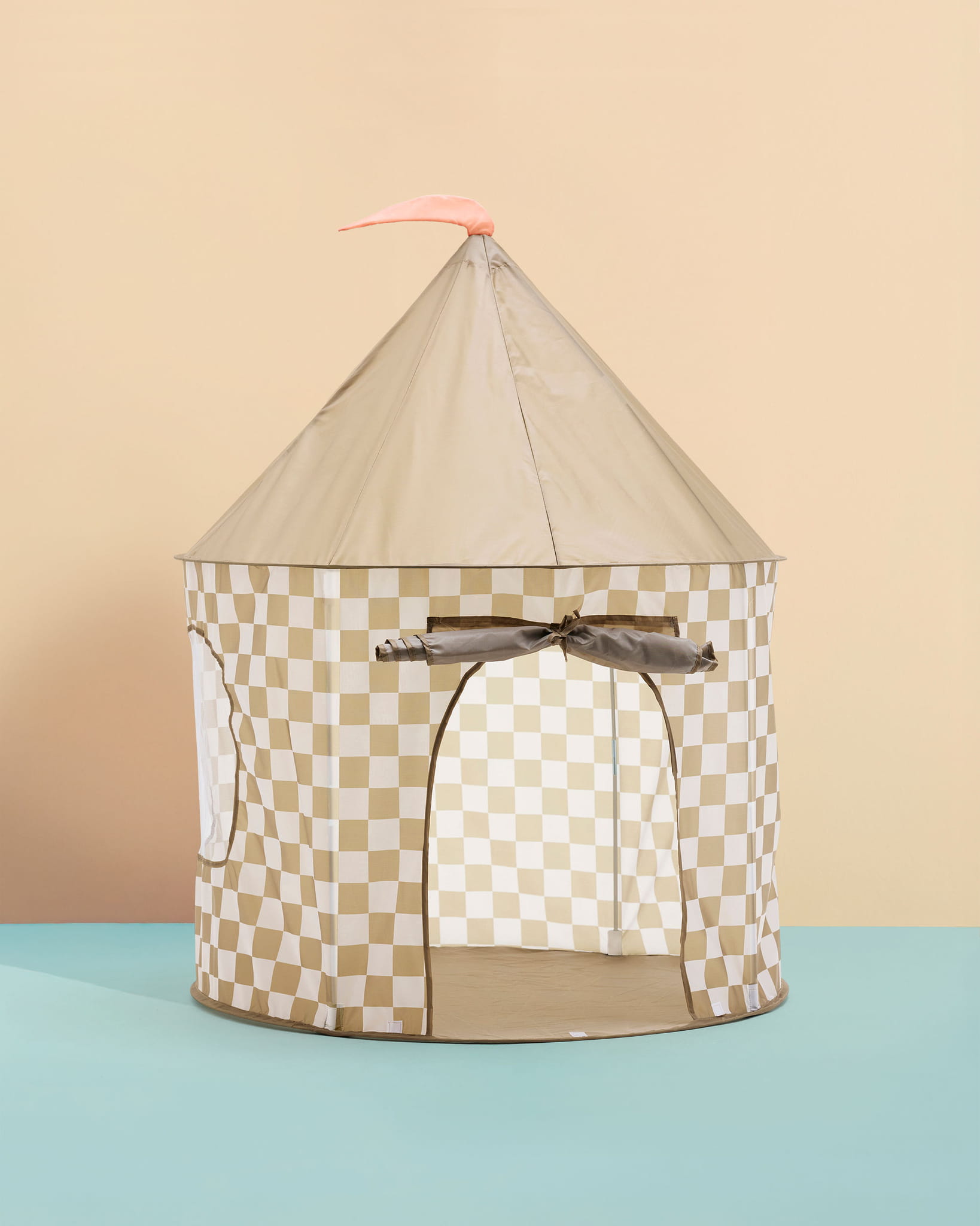 Namiot ma wszytą, materiałową podłogę i jest przeznaczony do użytku wewnątrz pomieszczeń. Wykonany z trwałej tkaniny poliestrowej, został zaprojektowany tak, aby dobrze znosić codzienną zabawę. Kraciasty wzór w kolorze khaki nadaje mu spokojny, neutralny wygląd, który łatwo dopasować do większości wnętrz. Dodaj kilka poduszek lub miękką matę, aby stał się jeszcze bardziej przytulny.
