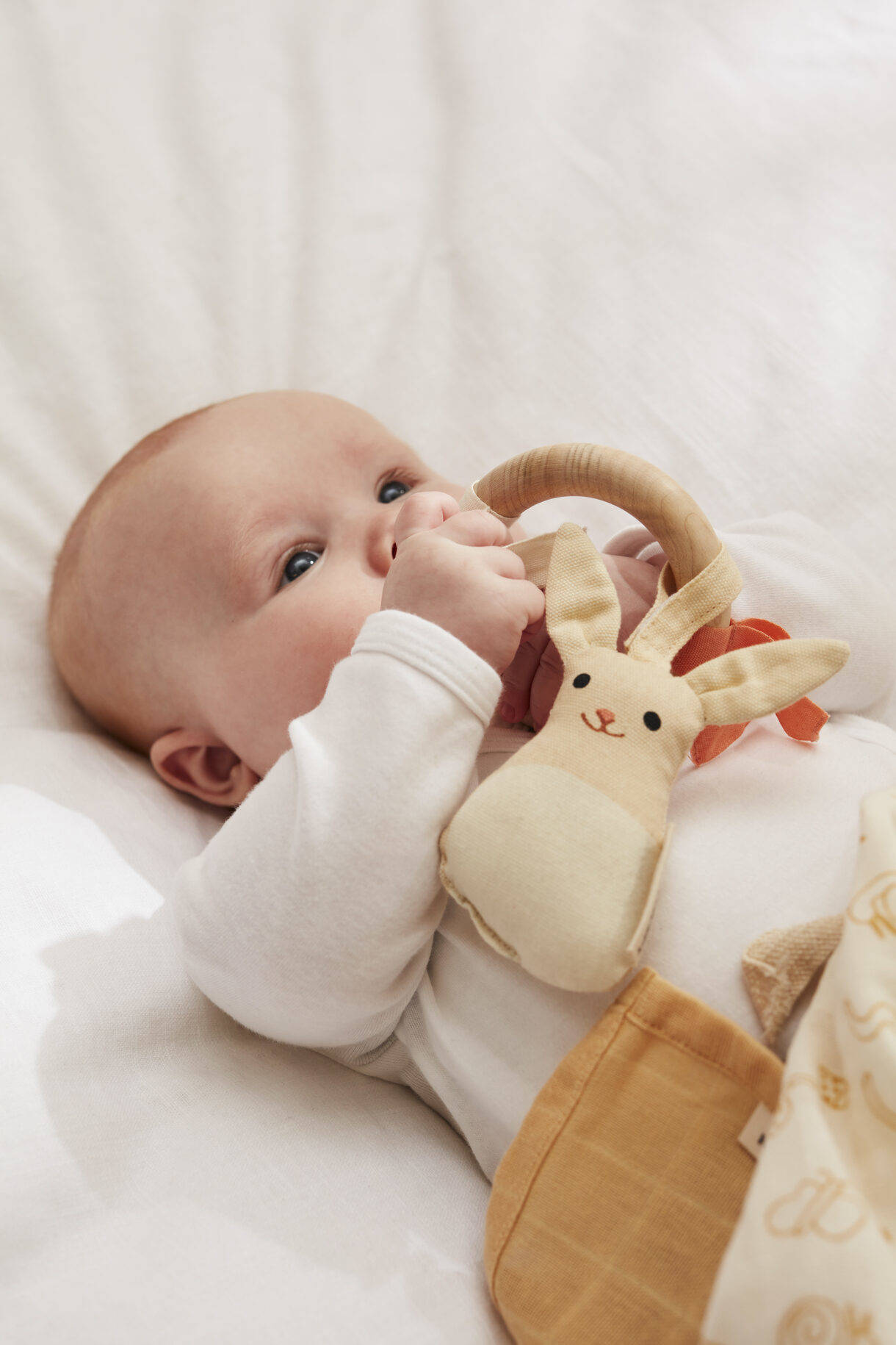 Mięciutką zabawkę z zapięciem na rzep łatwo odczepisz, by zabrać ją na przejażdżkę. Możesz ją przyczepić do wózka albo położyć na przewijaku. Elementy o różnej fakturze: drewniane kółko, z drewna bukowego z certyfikatem FSC do gryzienia, chwytania i zabawy; kolorowe wstążeczki i mięciutki króliczek stymulują zmysły i pozytywnie wpłyną na rozwój sensoryczny Twojego dziecka.