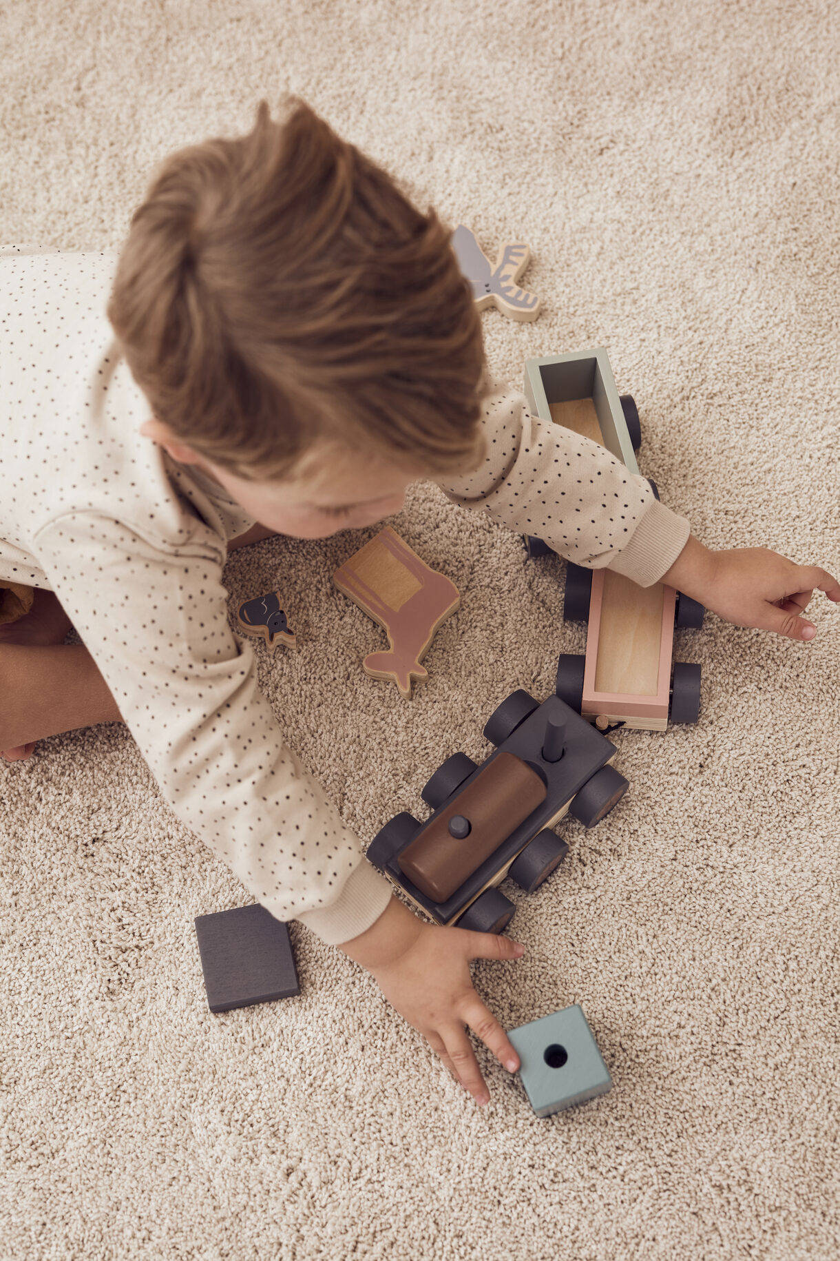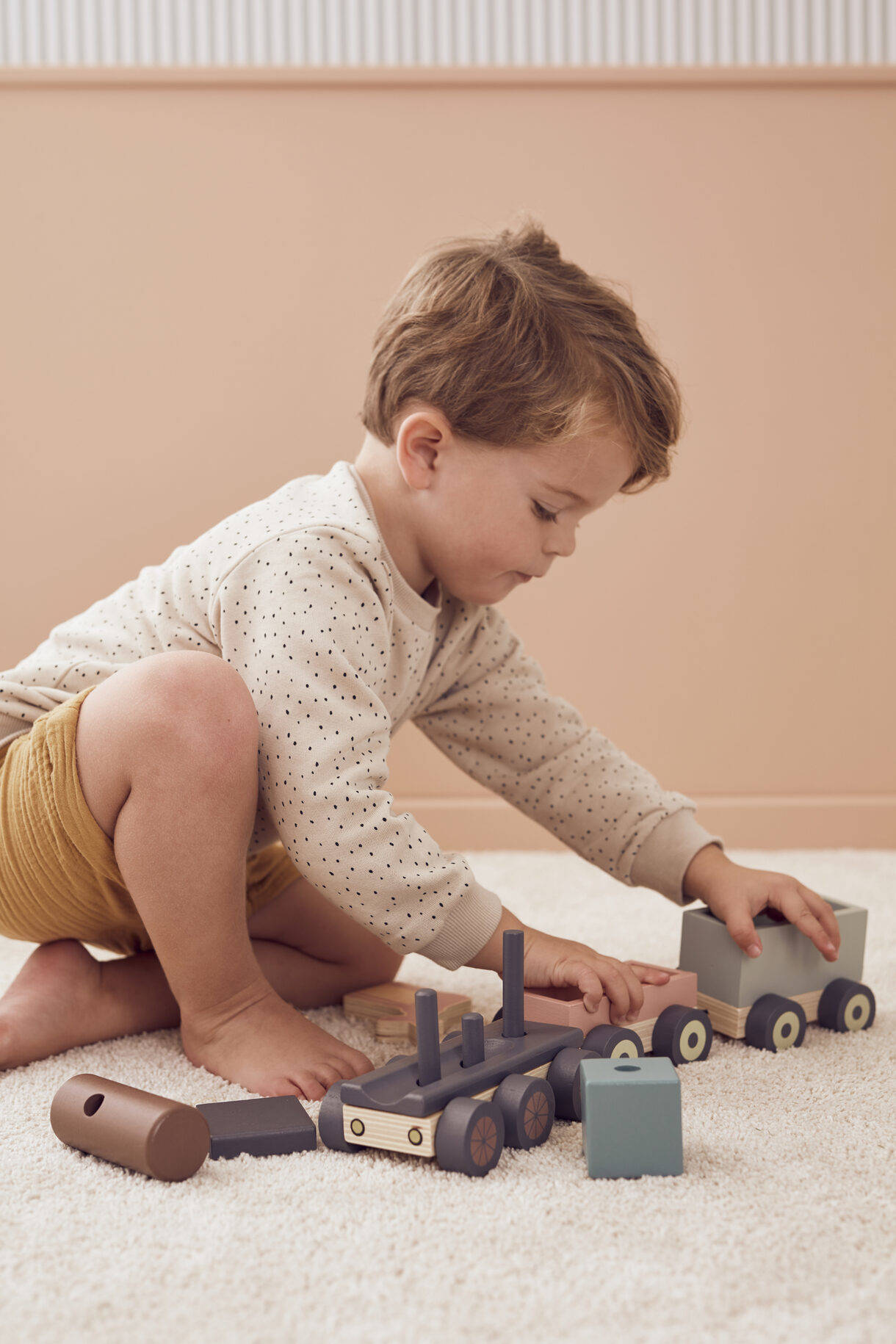 Drewniany pociąg z lokomotywą, zbudowaną z klocków, oraz dwoma wagonami, które można łatwo łączyć i rozłączać.