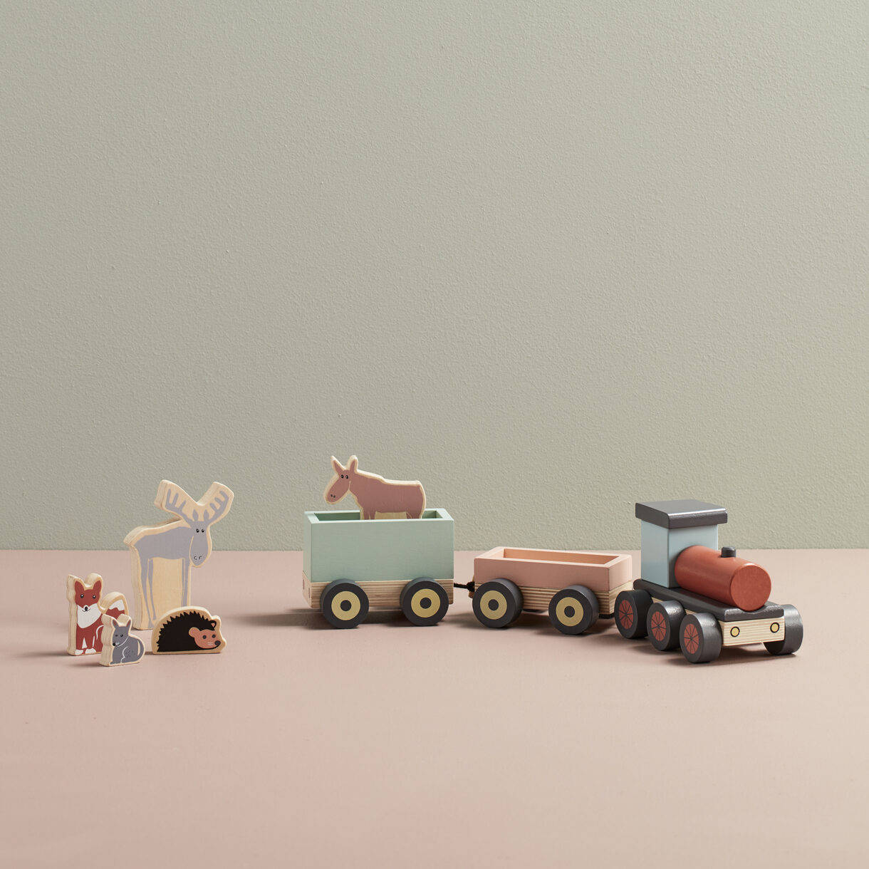Zestaw zawiera pięć różnych figurek zwierząt, które mogą podróżować pociągiem.