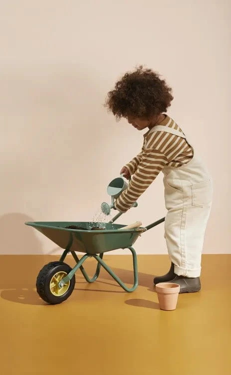 Zabawa taczką to świetny sposób na rozwijanie siły fizycznej dzieci. Kierowanie taczką wymaga także balansowania przednim kołem, więc ćwiczy koordynację. Pomóż w pracach ogrodniczych na świeżym powietrzu lub po prostu transportuj wymyślone lub prawdziwe przedmioty, takie jak piasek, kamienie lub artykuły ogrodnicze. Taczka metalowa malowana proszkowo, z kołem wykonanym z polipropylenu (PP) i miękkimi uchwytami/rączkami.