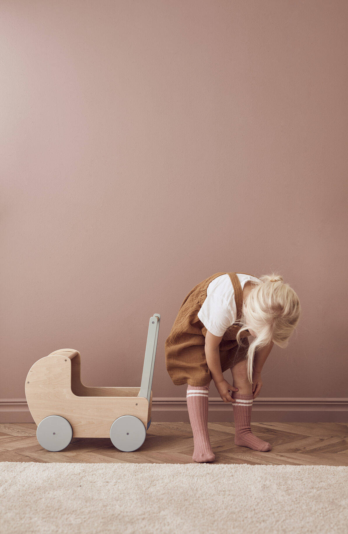 - Materiał: Wózek dla lalek: sklejka, buk. Rączka: sosna, schima. Koła: MDF. Tkanina: bawełna. Wypełnienie poduszki: poliester.