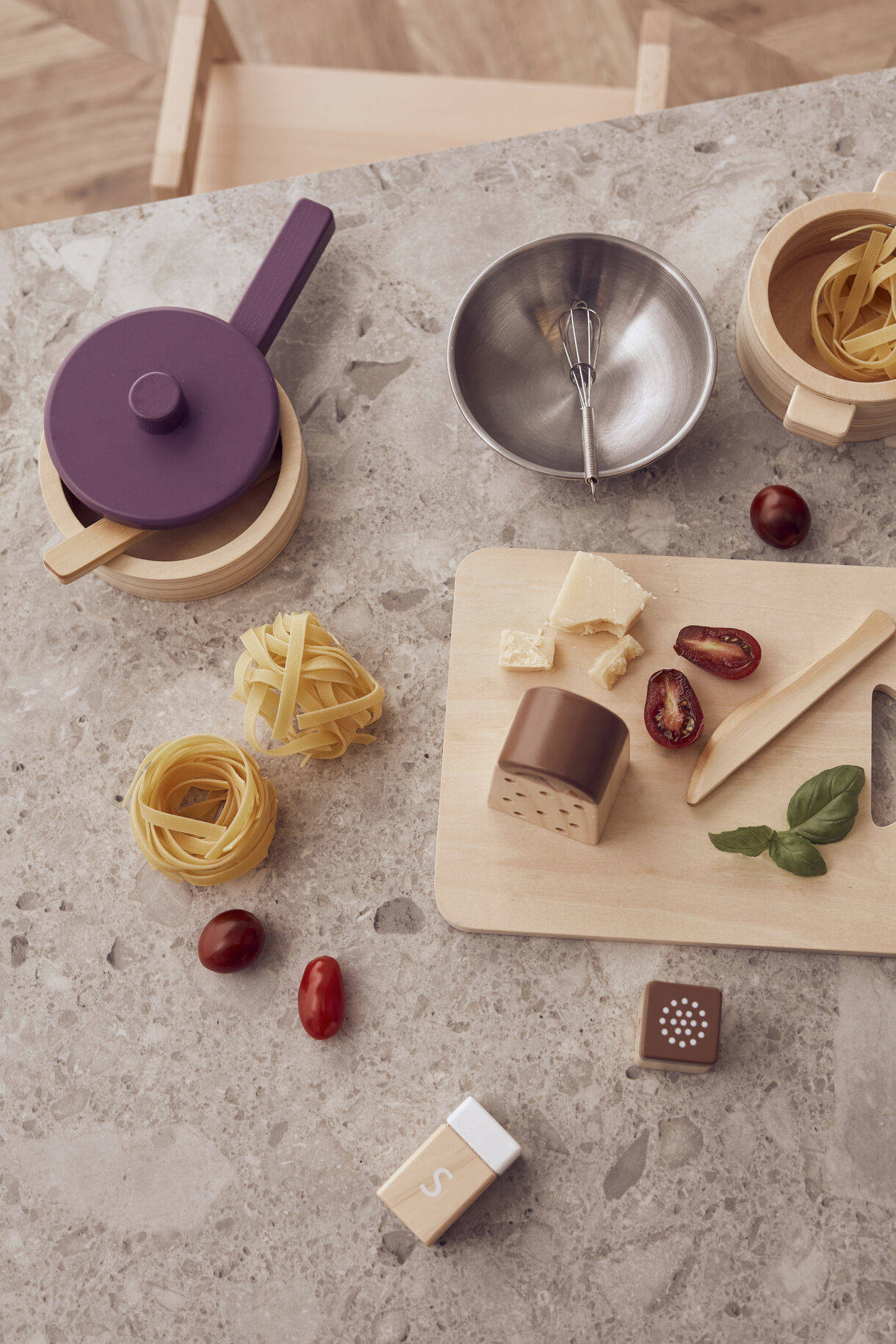 - Materiał: Garnek: sklejka, MDF. Patelnia: sklejka, buk. Miska, trzepaczka: stal nierdzewna. Deska do krojenia, tarka, sztućce, sól i pieprz: buk.