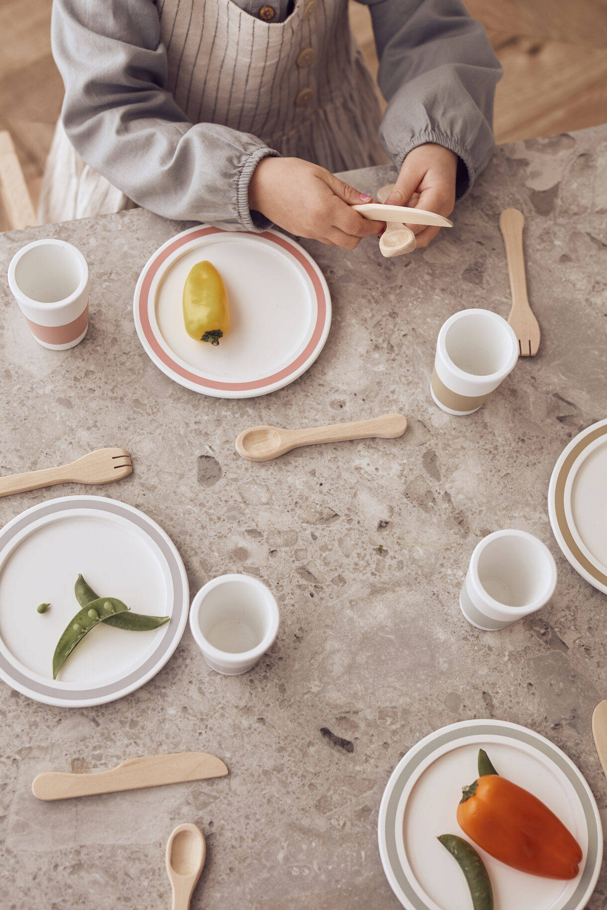Obiad na stole! Kompletny drewniany zestaw obiadowy dla 4 osób, składający się z 20 elementów. Zawiera 4 drewniane talerze, 4 kubki, 4 noże, widelce oraz łyżki i jest doskonałym dodatkiem do każdej drewnianej kuchni małego kucharza. Z taką zabawką odgrywanie ról sprawi jeszcze więcej radości. Wystarczy odrobina wyobraźni i ten zestaw, by pomysły na zabawę nigdy się nie skończyły, a czas płynął szybciej.