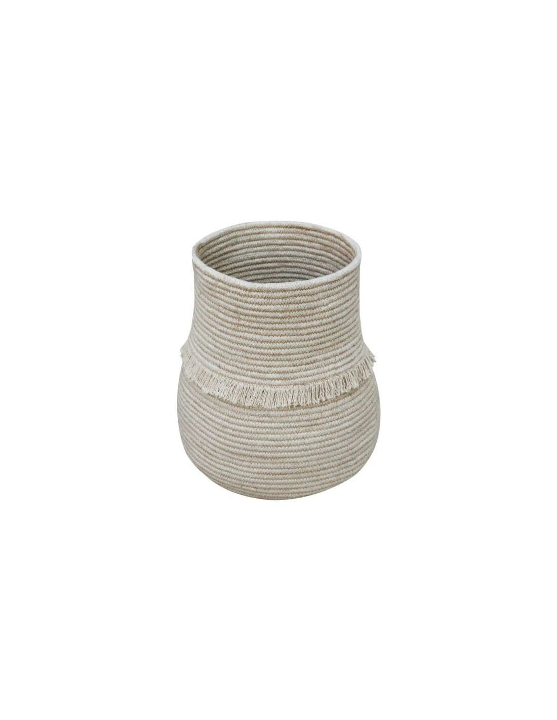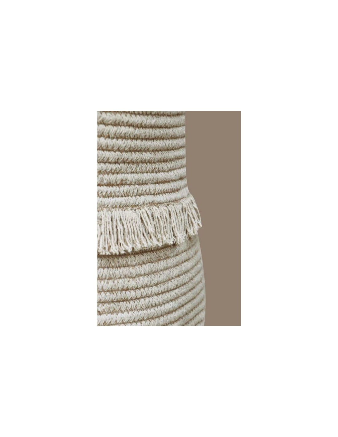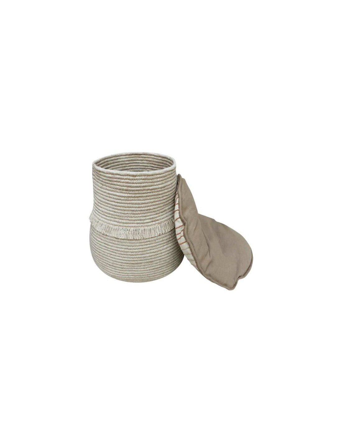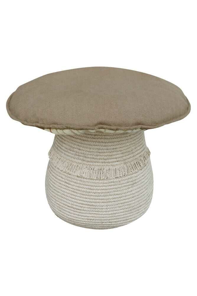 Dekoracyjne rozwiązanie 2 w 1. Gigantyczny grzyb Russula składający się z praktycznego, przestronnego kosza do przechowywania i miękkiej poduszki jako górnej pokrywy. Kosz, lekko zakrzywiony, wykonany jest z plecionych lin, przy użyciu przędzy z przetworzonych butelek PET w połączeniu z bawełną, z ozdobnymi frędzlami. Górna część grzybka to miękka poduszka z bawełnianego płótna w kolorze naturalnym i jasnobrązowym, z ozdobnymi haftowanymi ściegami, imitującymi "kapelusz" grzyba.