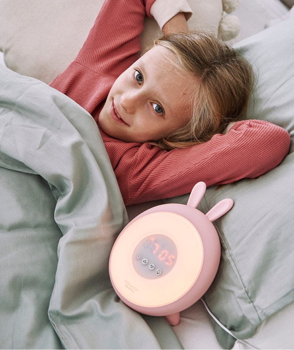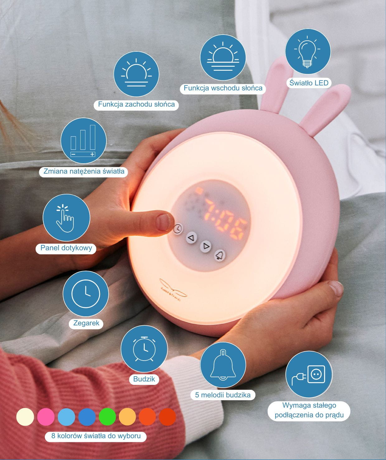 Lampka Królik z zabawnymi uszami wybudza powoli łagodnym światłem i dźwiękami natury, a na koniec dnia stopniowo wygasza światło, gdy zbliża się pora snu. Sprzyja uregulowaniu naturalnego rytmu dobowego i wpływa pozytywnie na zdrowie i samopoczucie.