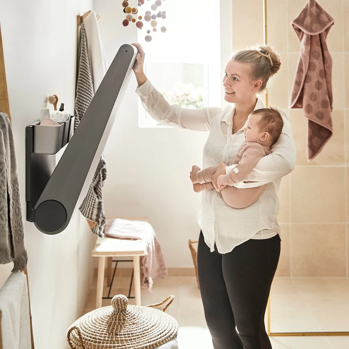 Leander Wally™ to odpowiedź na potrzeby współczesnego domu. Jego konstrukcja i niewielkie rozmiary pozwalają zaoszczędzić sporo miejsca. Gdy nie używasz przewijaka, możesz go złożyć, podnosząc blat. Leander Wally™ świetnie się sprawdzi nie tylko w pokoju dziecięcym, ale również w łazience – to doskonałe rozwiązanie dla każdego, kto ceni zarówno funkcjonalność, jak i prywatność oraz dyskrecję.