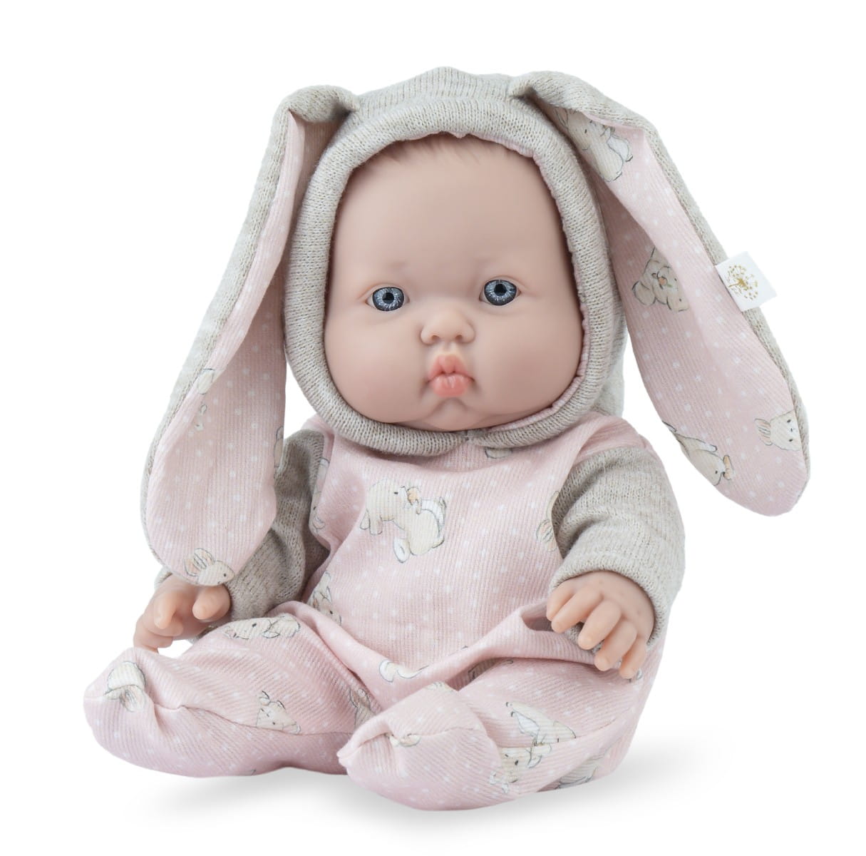 Niewielki, 28 cm, uroczy bobas w ślicznym stroju króliczka to oryginalna wersja popularnego modelu Betty, zaprojektowanego i ręcznie wykonanego w Hiszpanii w firmie Marina & Pau. Urzeka słodki wyraz twarzy, wyrzeźbione na główce włoski niemowlęce oraz jasnoniebieskie, ręcznie malowane otwarte oczy. Podkreślone rysy twarzy, wyrzeźbione linie papilarne, dołeczki na piąstkach czy fałdki pod kolanami sprawiają, że bobas wygląda jak żywy. Dziewczynka została wykonana z gładkiego, przyjemnego w dotyku, bezpiecznego winylu. Ma zaznaczoną płeć. Proponowana dla dzieci w wieku od 3 lat, świetnie sprawdza się także podczas zabawy w kąpieli. Nie posiada włosów ani rzęs, brwi są lekko zaznaczone. Ruchome rączki, nóżki oraz główka sprawiają, że można ułożyć lalę w różnych pozycjach. Betty siedzi samodzielnie.