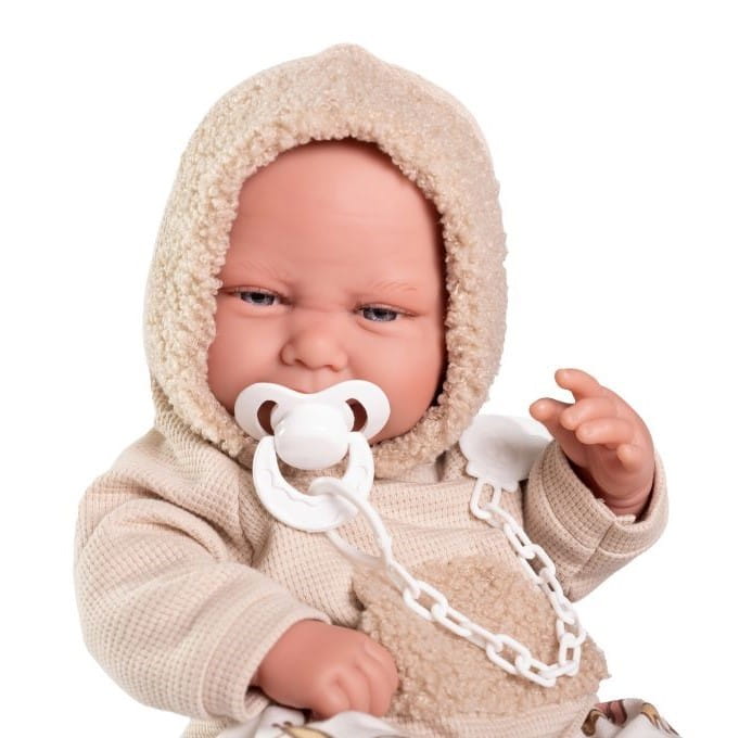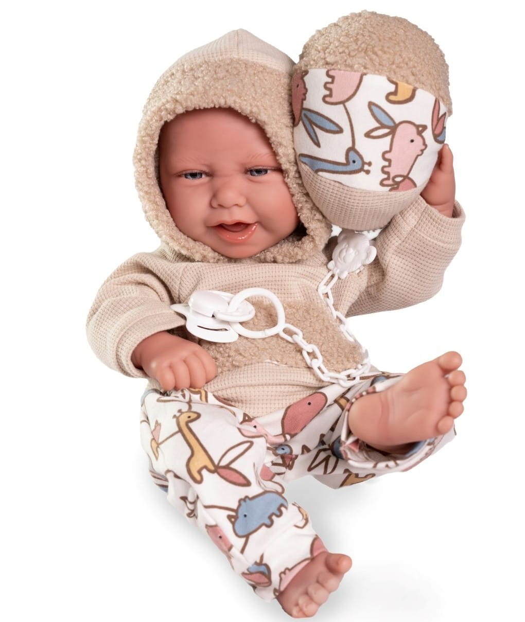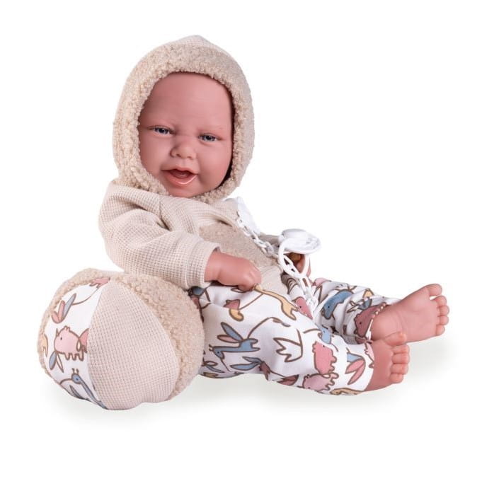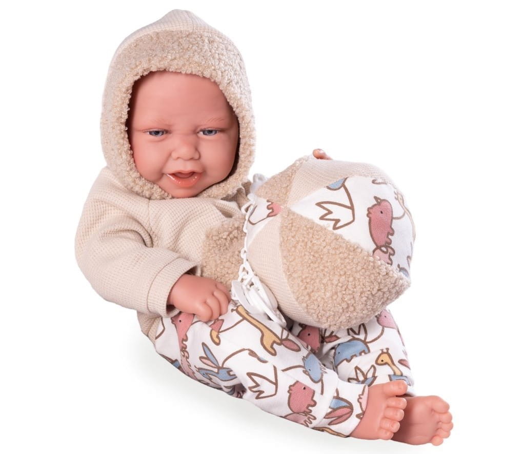Lalka hiszpańska 50420 marki Antonio Juan to marzenie każdego dziecka, uwielbiającego zabawę w odgrywanie ról. Autentyczny wygląd pozwala z łatwością wcielić się w rolę troskliwego rodzica. Carlo ubrany jest w oryginalnie zaprojektowany, ciepły strój: bluzę z kapturem oraz wzorzyste spodenki. Zwracają uwagę futrzane wykończenia. Strój z łatwością można zdjąć, a bobasa przebrać lub wykąpać.