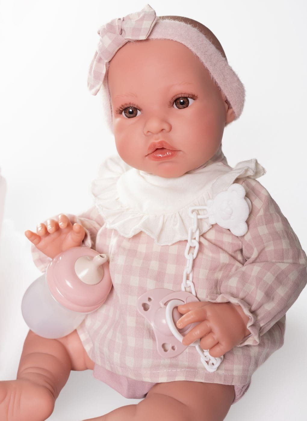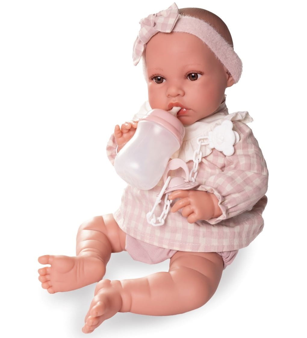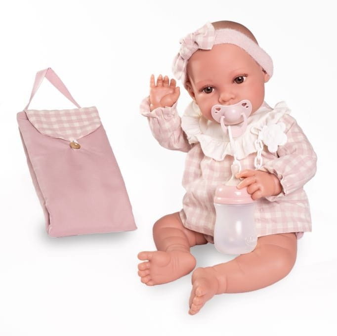Lalka hiszpańska 33002 marki Antonio Juan to marzenie każdego dziecka, uwielbiającego zabawę w odgrywanie ról. Autentyczny wygląd i waga bobasa pozwalają z łatwością wcielić się w rolę troskliwego rodzica. Erika ubrana jest w oryginalnie zaprojektowaną, biało-różową bluzeczkę w modną kratkę. Elegancji dodaje biała wstawka z falbanką tuż przy dekolcie. Outfit dopełniają krótkie pudrowe spodenki oraz opaska na głowę. Strój z łatwością można zdjąć, ponieważ posiada on z tyłu wygodne zapięcie na rzep. W zestawie znajduje się także plastikowa butelka oraz przypinany smoczek na łańcuszku a także kocyk do przewijania.
