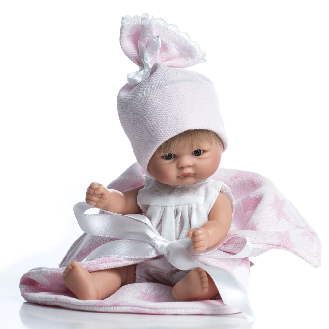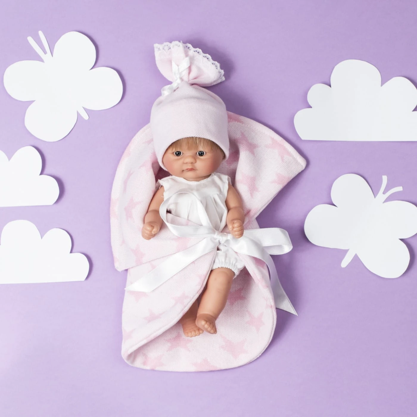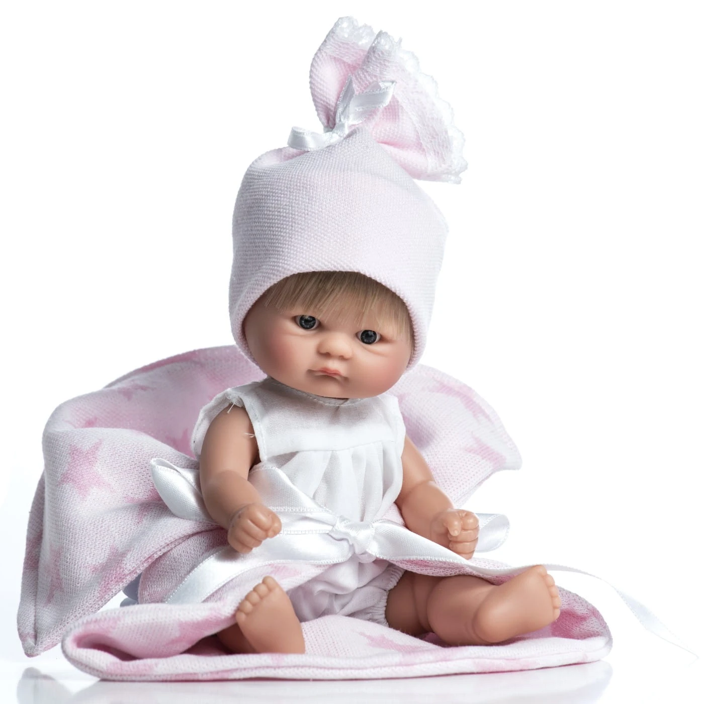 Bomboncin ubrany jest w białe body z krótkim rękawkiem. Nogawki spodenek zakończone są gumkami, aby lepiej dopasowały się do nóżki bobasa. Ubranko jest zapinane na rzep, co ułatwia dziecku zdejmowanie stroju i sprawia, że zabawa w przebieranie staje się jeszcze ciekawsza. Wygląd lalki uzupełnia różowa czapeczka wykonana z przyjemnej w dotyku dzianiny oraz ozdobiona wstawkami z białej koronki. Dodatkowo komplet uzupełnia jasnoróżowy kocyk z motywem w gwiazdki. Mięciutki w dotyku dodatek sprawdzi się idealnie podczas spaceru i przenoszenia bobasa. Wystarczy położyć laleczkę i zawiązać koc wstążką, aby móc ją przenieść. Laleczkę można przebierać bez końca, przytulać oraz zabierać ze sobą na drzemkę.