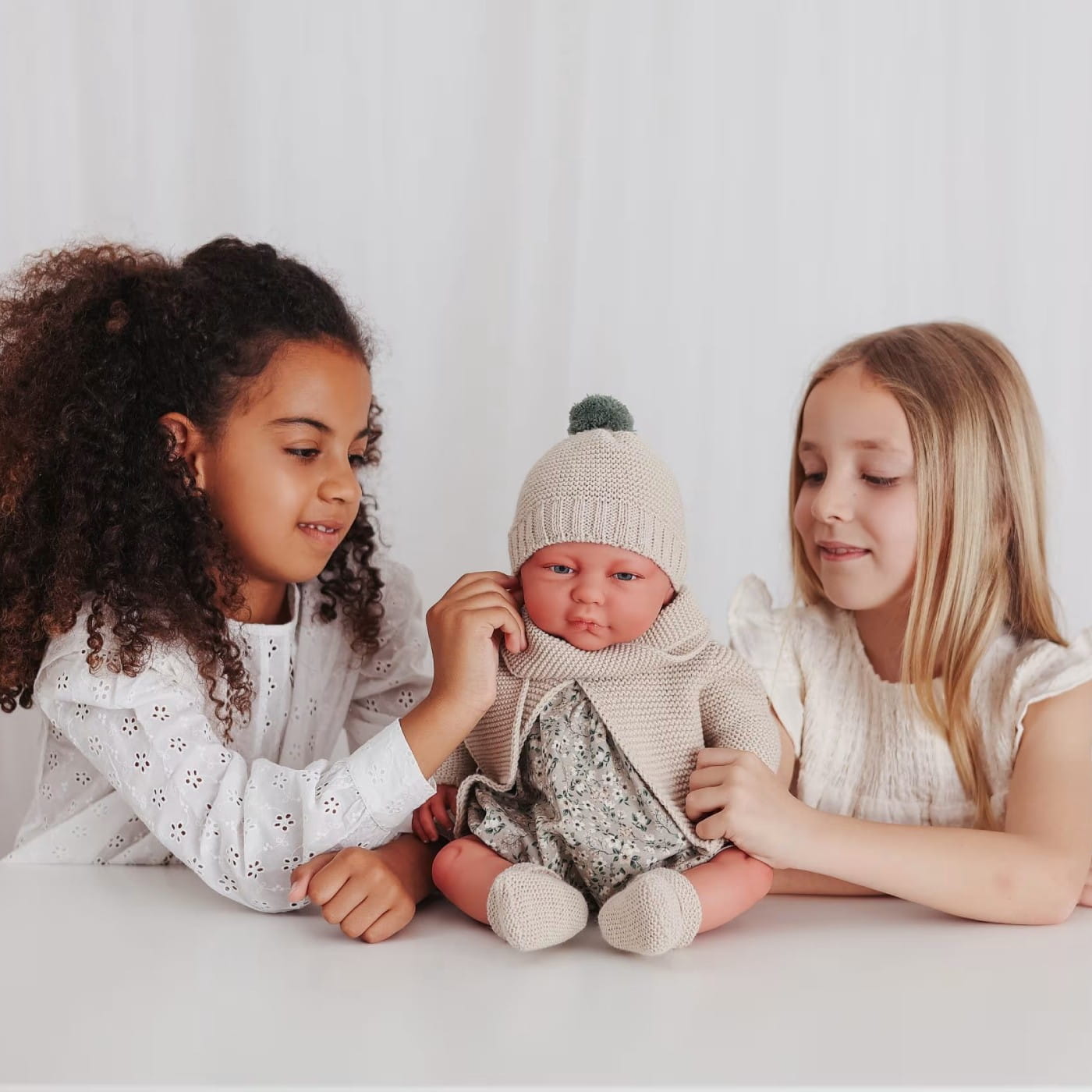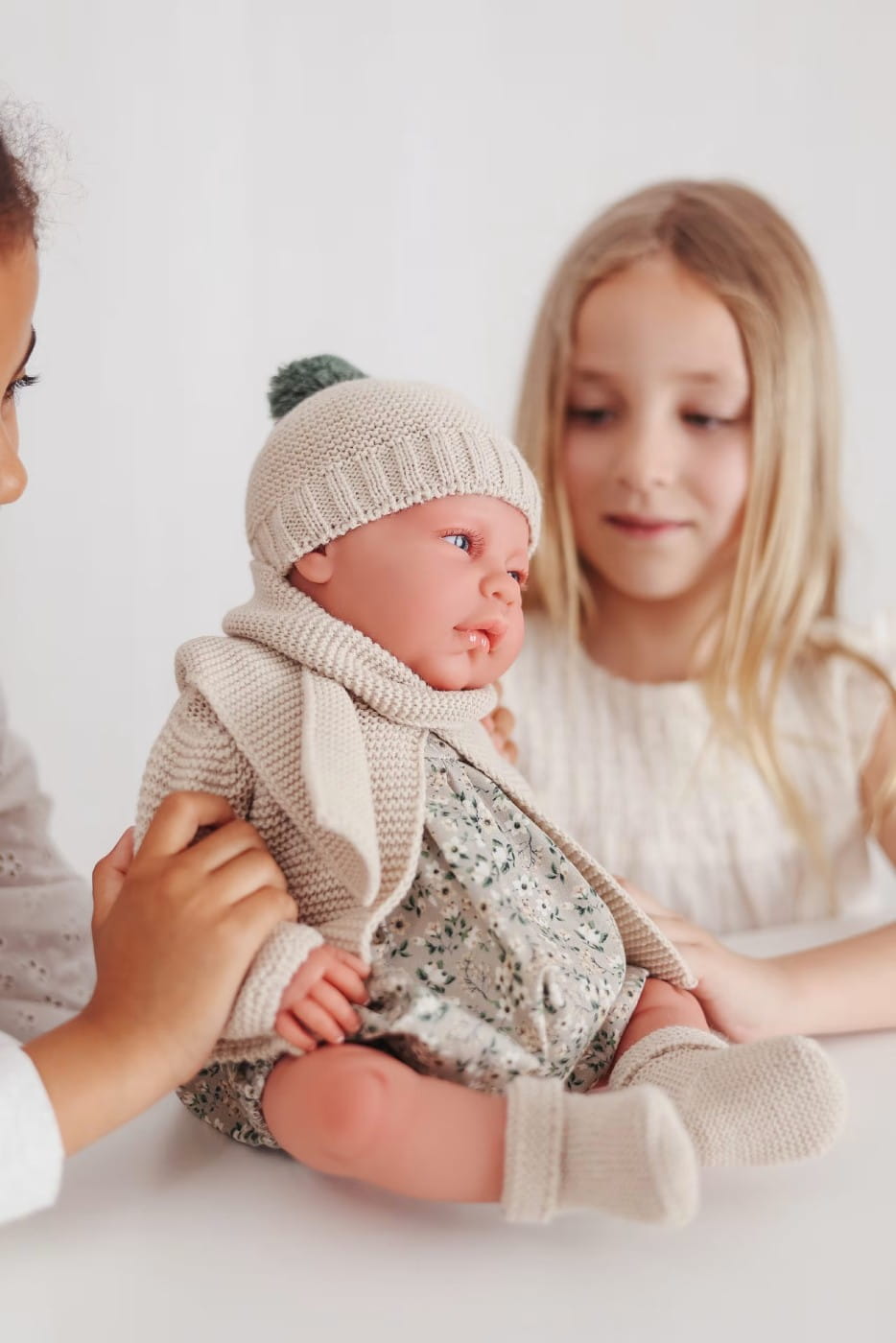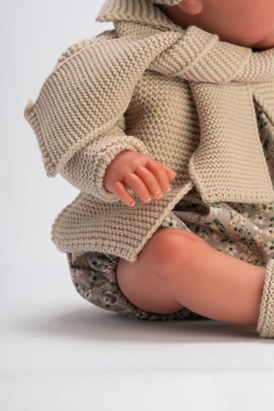 Lalka hiszpańska Reborn ASI0497820 posiada wysokiej jakości stylowe, ręcznie szyte ubranka i atrakcyjne akcesoria w stonowanej kolorystyce: