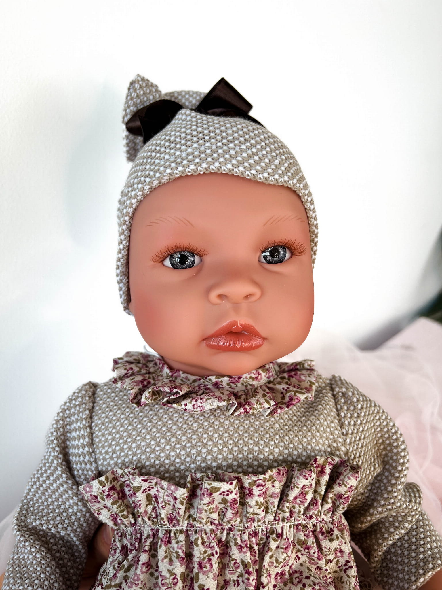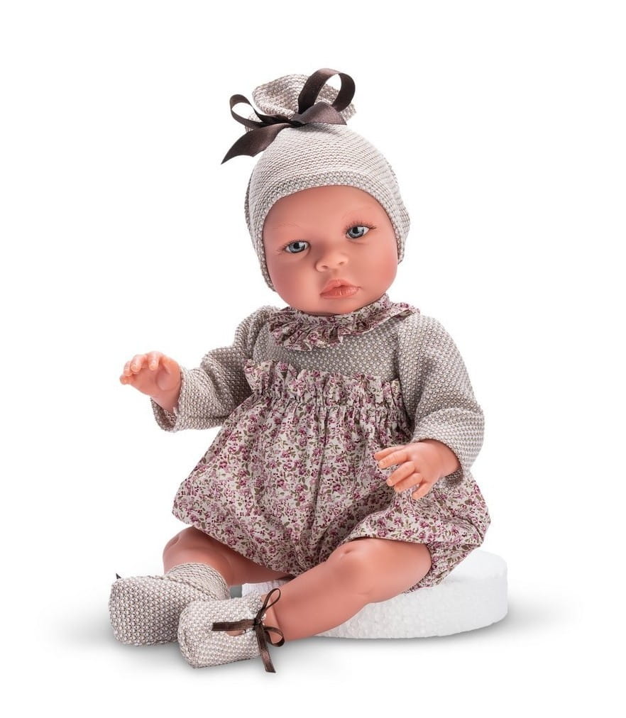 Lalka hiszpańska marki ASI ubrana jest w wysokiej jakości, stylowy rampers z długim rękawem, czapeczkę oraz ozdobne miękkie buciki. Strój uszyto z dwóch rodzajów materiałów: beżowej bawełny w różową łączkę oraz nieco grubszej, kakaowej tkaniny o delikatnej fakturze. Finezji dodaje falbanka oraz lśniące tasiemki z czekoladowej satyny. Wszystkie części garderoby można z łatwością zdjąć. Bobas zapakowany jest w eleganckie różowo-białe pudełko firmowe z wieczkiem. Leo posiada wszystkie wymagane certyfikaty bezpieczeństwa CE i wyprodukowany jest w całości w Hiszpanii. Do kompletu proponujemy nosidełko oraz wózek z kolekcji akcesoriów ASI Martina.