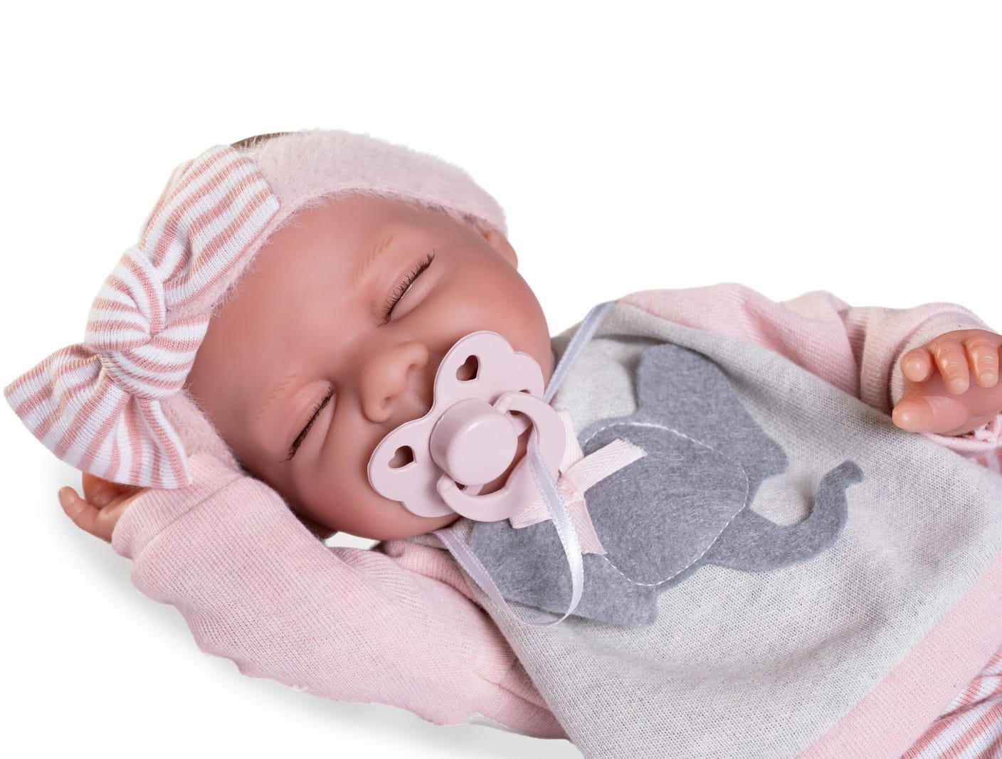 Realistycznie wyglądający bobas posiada wyrzeźbione włoski oraz delikatnie malowane brwi, paznokcie, linie papilarne i fałdki. Baby Toneta od marki Antonio Juan ubrana jest w ciepłą szaro-różową bluzę oraz krótkie spodenki w paseczki. Uroku dodaje aplikacja o kształcie głowy słonia oraz luksusowo prezentująca się opaska na głowę z kokardą. Wszystkie elementy garderoby można łatwo zdjąć, a maleństwo przebrać w inny zestaw ubranek. W zestawie znajduje się także smoczek na tasiemce satynowej.