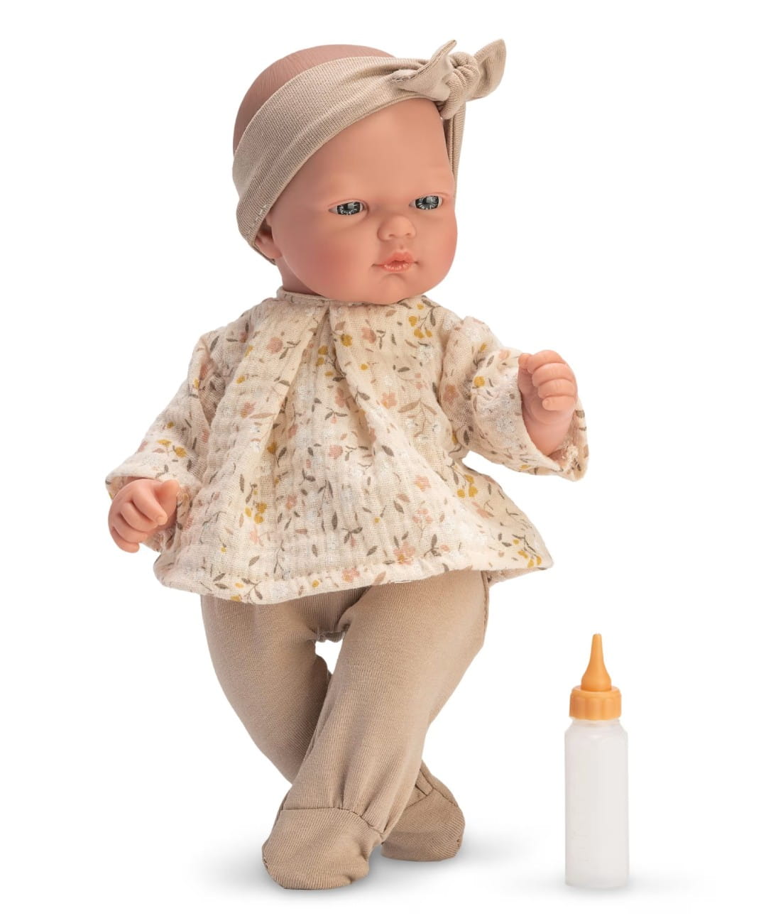 Lalka hiszpańska ubrana jest w jasnobeżową bluzeczkę, uszytą ręcznie z wysokiej jakości miękkiej tkaniny w delikatny kwiatowy wzór. Zapięcie na rzep ułatwia dziecku przebieranie bobasa. Outfit uzupełniają półśpiochy oraz elastyczna opaska wiązana na kokardę.