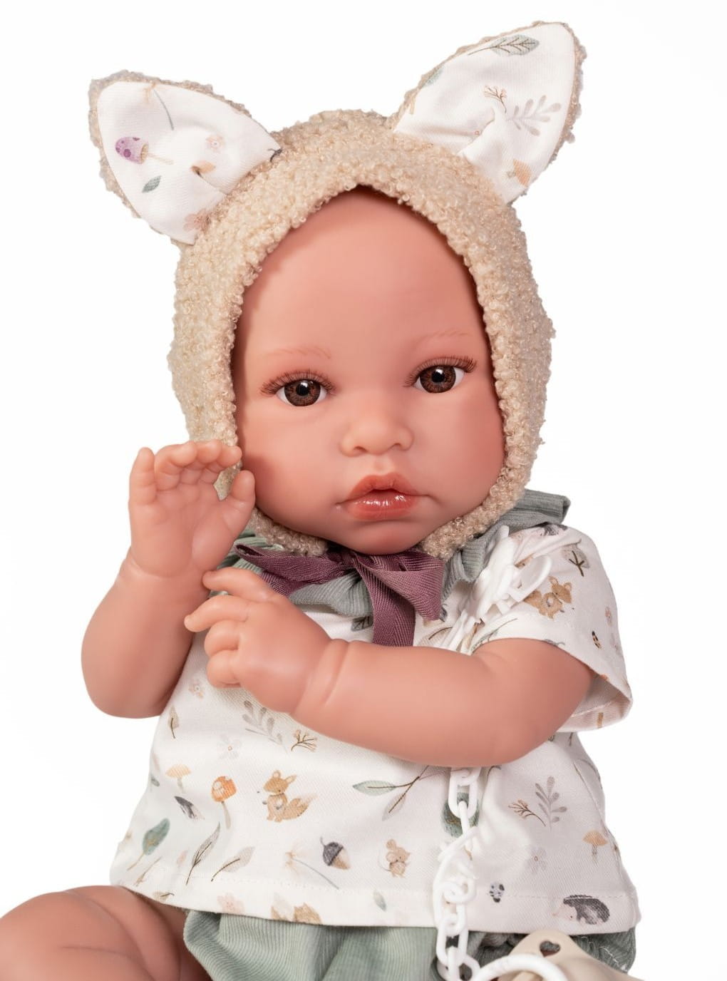 Lalka hiszpańska 33014 marki Antonio Juan to marzenie każdego dziecka, uwielbiającego zabawę w odgrywanie ról. Autentyczny wygląd i waga bobasa pozwalają z łatwością wcielić się w rolę troskliwego rodzica. Erik ubrany jest w oryginalnie zaprojektowaną bawełnianą bluzeczkę w roślinny wzór, krótkie zielone spodenki oraz futrzaną wiązaną czapeczkę ze słodkimi uszkami. Strój z łatwością można zdjąć. W zestawie znajduje się także przypinany smoczek na łańcuszku oraz nosidło – chusta na ramię dla dziecka.