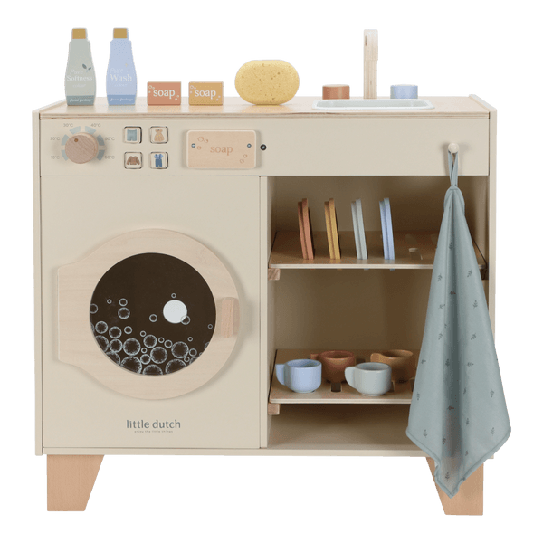 Drewniana pralka i zmywarka Little Dutch to połączenie estetyki i zabawy w najlepszym wydaniu. Zestaw nie tylko dostarcza dzieciom wielu godzin radości, ale również pięknie prezentuje się w pokoju dziecięcym. Zabawka wykonana jest z solidnego drewna, malowanego bezpiecznymi farbami na bazie wody, dzięki czemu jest trwała, estetyczna i w pełni bezpieczna dla dzieci. To piękny, ponadczasowy element zabawy, który posłuży przez długie lata. Pralka doskonale komponuje się z lodówką oraz kuchnią Little Dutch, tworząc pełen uroku, kompletny kącik kuchenny.