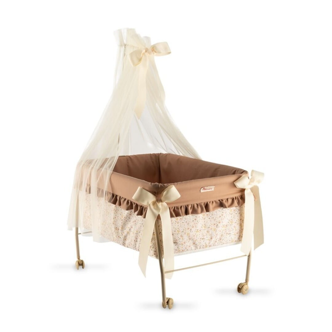 Łóżeczko dla lalki na kółkach posiada składany, lekki, metalowy, lakierowany na beżowo stelaż. Gondola wykonana została z wysokiej jakości bawełny w małe kwiatuszki. Falbankowe wykończenie, zwiewny tiul podwieszany na wąskiej metalowej konstrukcji oraz lśniące satynowe kokardy nadają całości luksusowego wyglądu.