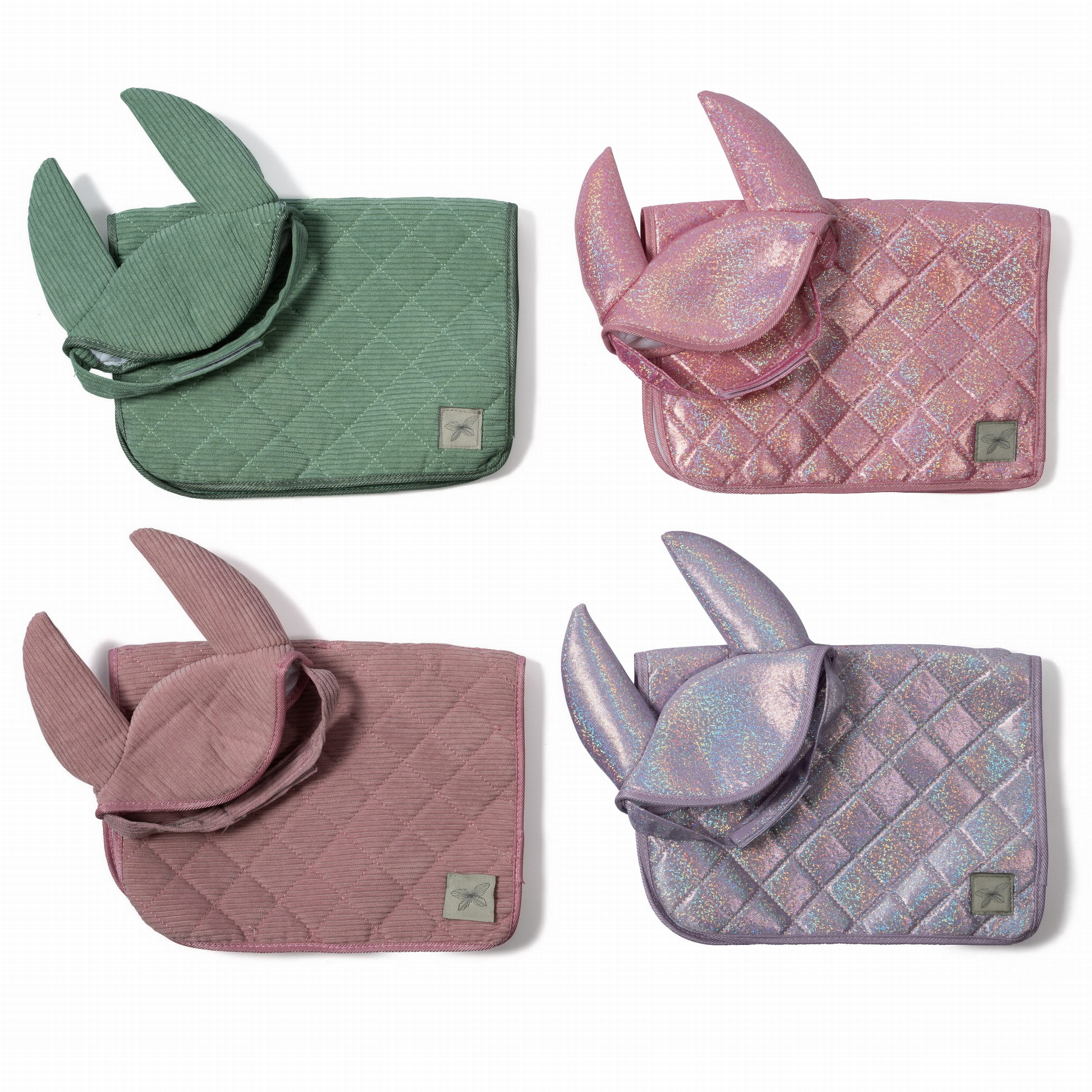 Bonetka, również w różowym sztruksowym wydaniu, idealnie uzupełnia zestaw dla małego jeźdźca. Chroni uszy konia przed hałasem i chłodem, zapewniając mu wygodę podczas jazdy. Co więcej, ten uroczy dodatek nadaje koni elegancki wygląd.