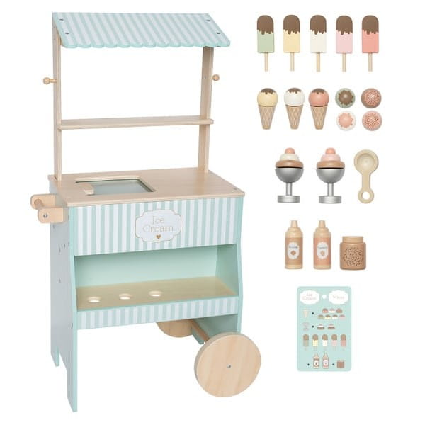 Drewniany sklep lodziarnia na kółkach szwedzkiej marki Jabadabado -to gwarancja udanej, kreatywnej i smacznej zabawy! Wszystkie dzieci uwielbiają lody - mobilny sklep duży wózek z lodami, pozwoli na serwowanie ulubionych smakołyków wszystkim misiom, lalom i członkom rodziny. Zabawa w dom, sklep czy lodziarnię świetnie pobudza dziecięcą wyobraźnię, rozwija słownictwo a nakładanie lodów ćwiczy sprawność manualną i koordynację ręka-oko. Świetny zestaw na prezent! W zestawie:-drewniany wózek na kółkach,-łyżka do nakładania lodów,-polewa truskawkowa,-syrop czekoladowy,-trzy lody z ruchomymi elementami do ich własnego tworzenia,-trzy lody na patykach -każdy o innym smaku,-dwa desery lodowe w pucharkach,-dzwoneczek