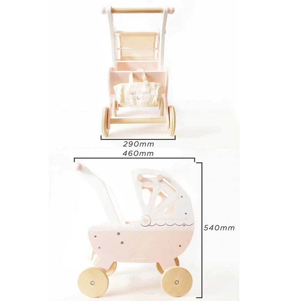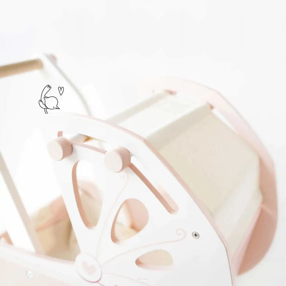 Pomalowany delikatną paletą kolorów różowego, kremowego i świeżego białego. Posiada solidną konstrukcję, miękki materac i unikalny, składany, ręcznie szyty dach, co sprawia, że jest to idealny wózek, aby zabierać pluszaki i lalki na spacer pełny stylu.