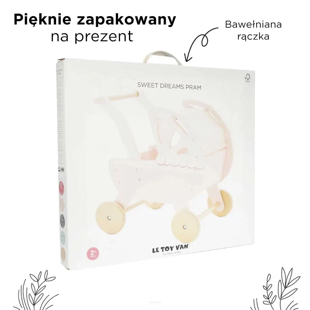 Weź laleczkę lub misia na spacer w tradycyjnym i stylowym drewnianym wózku.